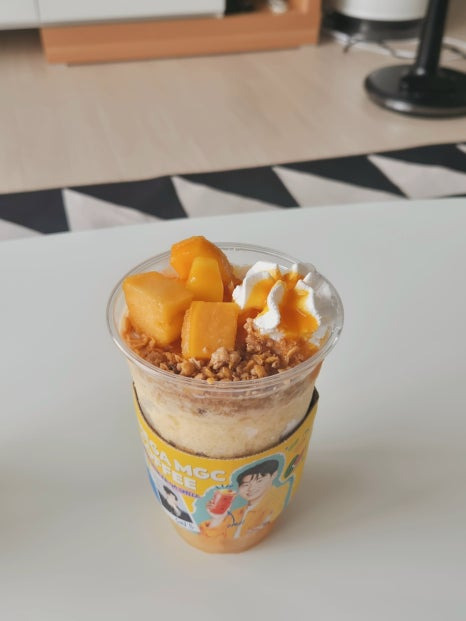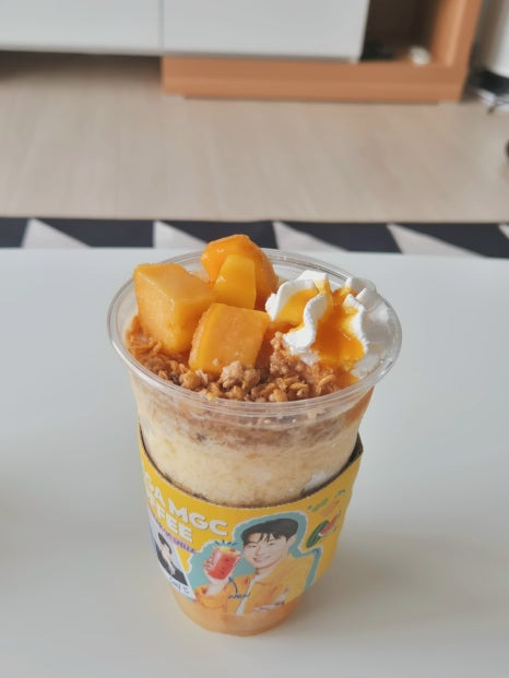 그리고 #망빙파르페 제품은 달콤한 망고와 코코넛칩, 휘핑크림, 믹스시리얼, 망고요거트로 이루어져 있는 컵빙수 이에요!