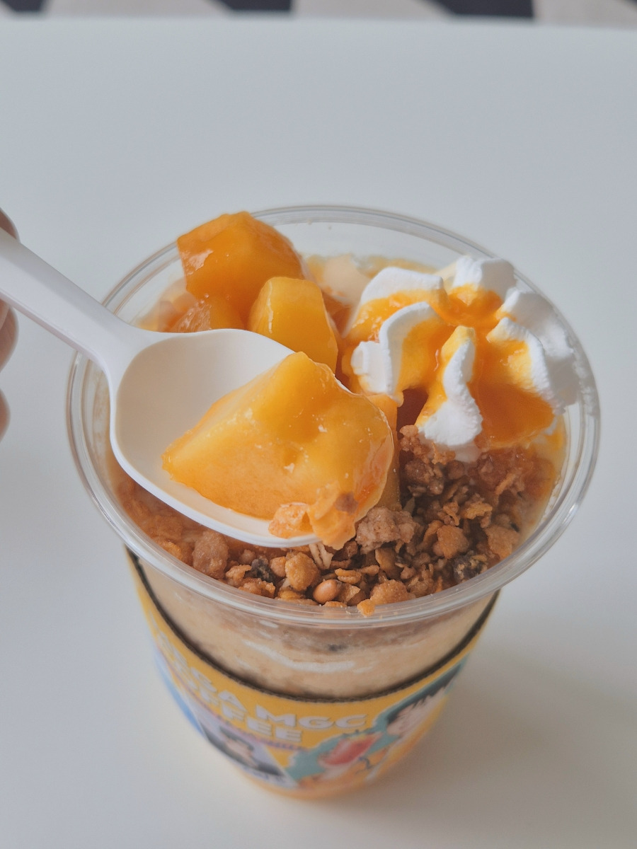 평소에 메가커피의 대표메뉴인 망고스무디와 비슷한 느낌이 들었는데 위에서부터 망고부터 천천히 먹기 시작했어요 상큼하면서 달달한 느낌이라 과일 빙수를 좋아하는 분들에게 좋을것 같아요 🧡🧡