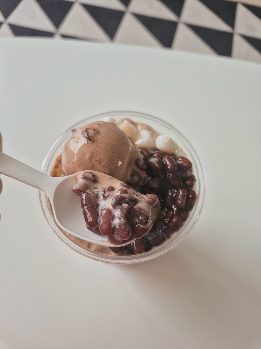 그리고 위에 아이스크림이 들어가 있고 팥과 젤라또, 믹스시리얼이 같이 들어가 있는데 진짜 평소에 팥 좋아하는 분들도 정말 너무 좋아하게 먹을 수 있을것 같아요 🤎🤎 이거야 말로 정말 호불호 없이 살짝 비비빅 아이스크림 녹인듯한 맛도 나면서 진짜 맛있더라고요.