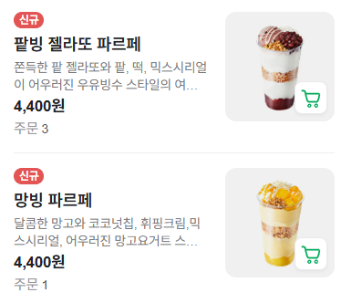 그리고 망빙 파르페는 4,400원 가격으로 컵빙수들은 모두 4,400원 가격으로 되어 있어요