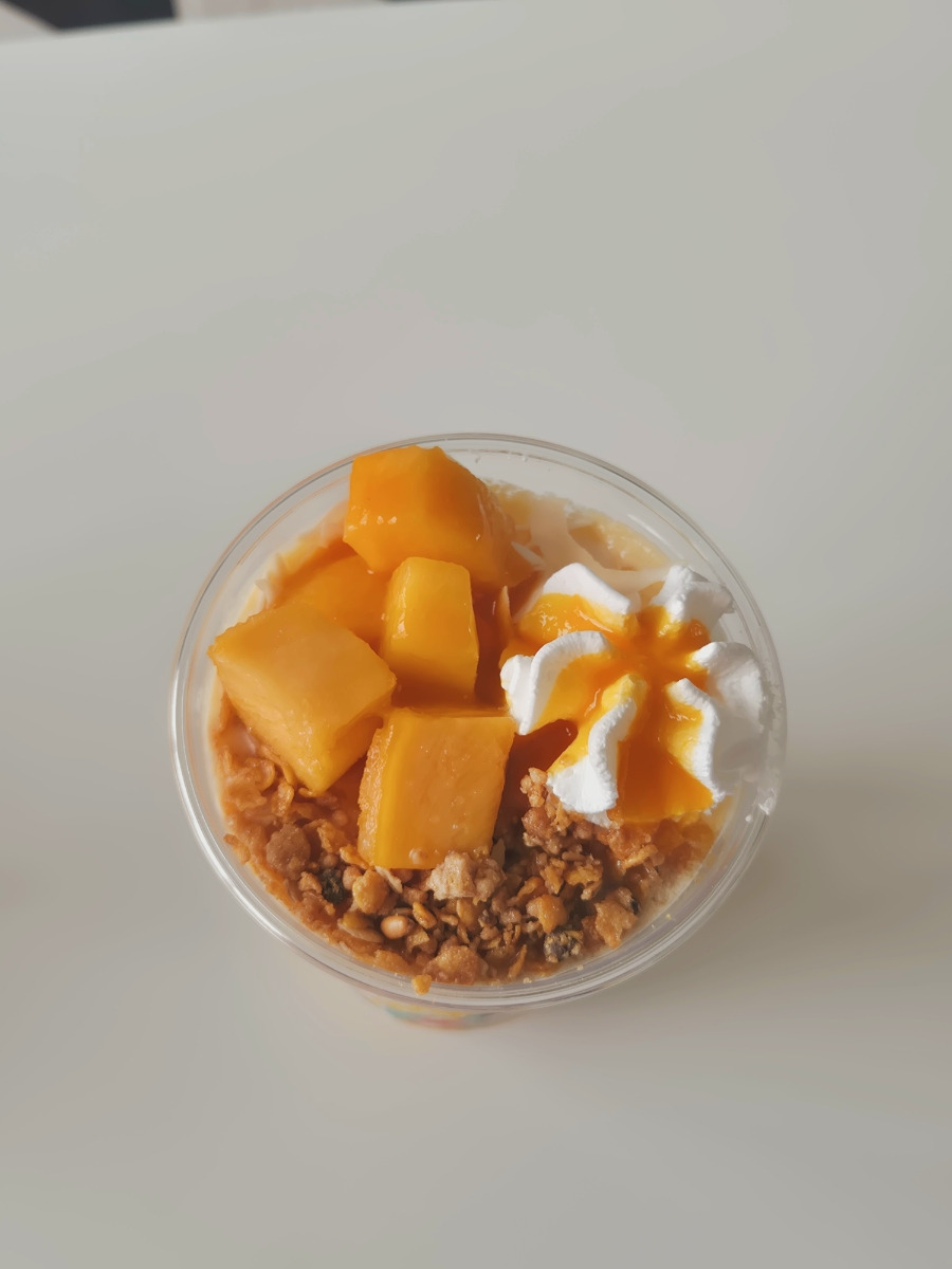 망빙파르페는 팥빙 보다는 조금 살짝 컵이 작은 느낌이 들었는데 안에는 망고부터 휘핑크림과 믹스시리얼 등 안에 들어가 있어요.